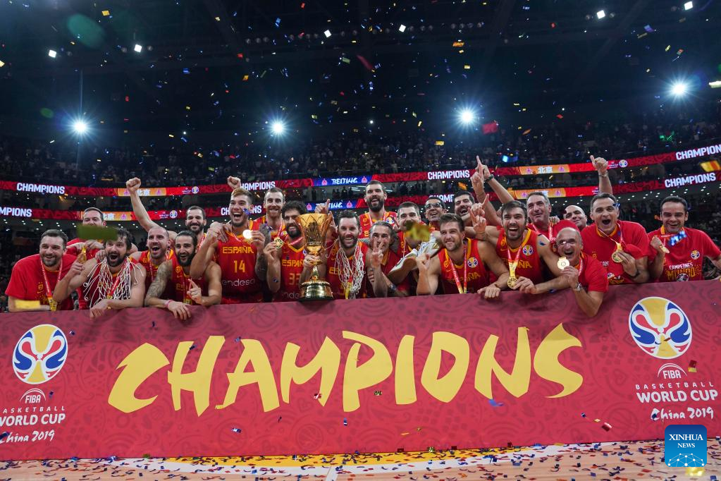 File photo taken on Sept. 15, 2019 shows team Spain celebrate during the awarding ceremony after the final match between Spain and Argentina at the 2019 FIBA World Cup in Beijing, capital of China. (Xinhua/Ju Huanzong)