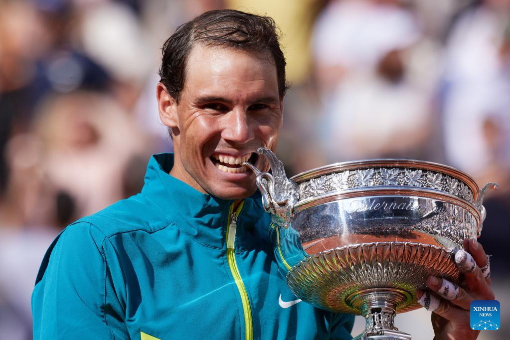File photo taken on June 5, 2022 shows Rafael Nadal of Spain poses with his trophy during the awarding ceremony after the men's singles final match between Rafael Nadal of Spain and Casper Ruud of Norway at the French Open tennis tournament at Roland Garros in Paris, France. (Xinhua/Meng Dingbo)