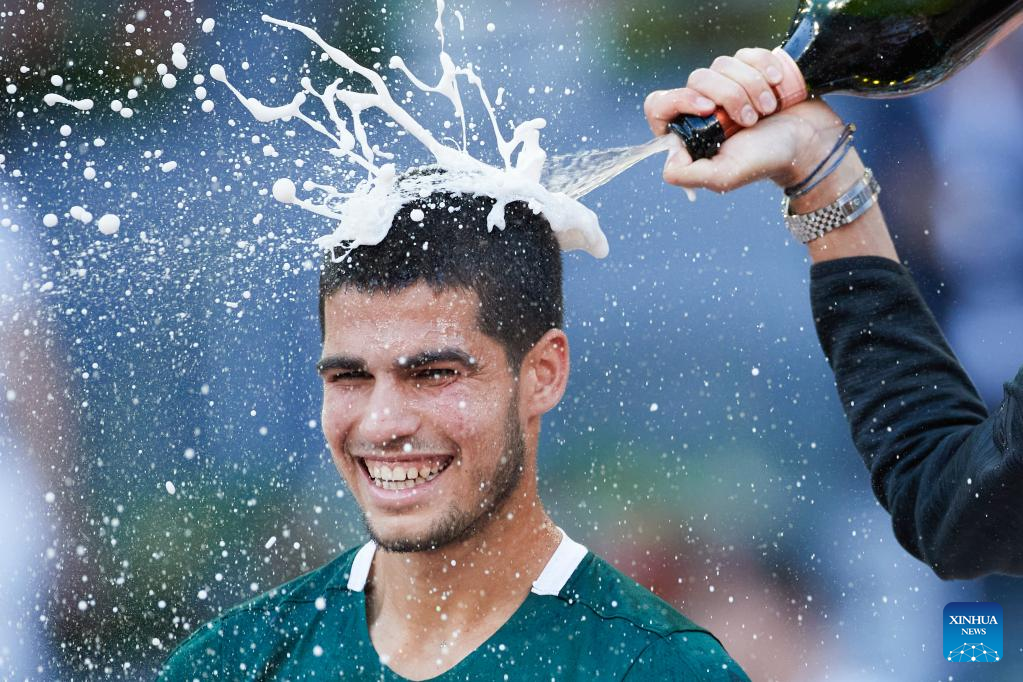 File photo taken on May 8, 2022 shows Carlos Alcaraz of Spain reacts on the podium after the men's singles final against Alexander Zverev of Germany at the Madrid Open in Madrid, Spain. (Xinhua/Meng Dingbo)
