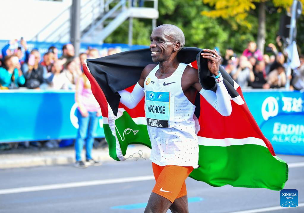 File photo taken on Sept. 25, 2022 shows Eliud Kipchoge of Kenya celebrates after the Berlin Marathon 2022 in Berlin, Germany. (Xinhua/Ren Pengfei)