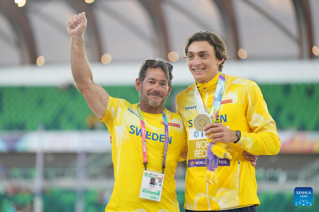 File photo taken on July 24, 2022 shows Armand Duplantis (R) of Sweden hugs his father and coach Gregory Duplantis during the men's pole vault awarding ceremony at the World Athletics Championships Oregon22 in Eugene, Oregon, the United States. (Xinhua/Wu Xiaoling)