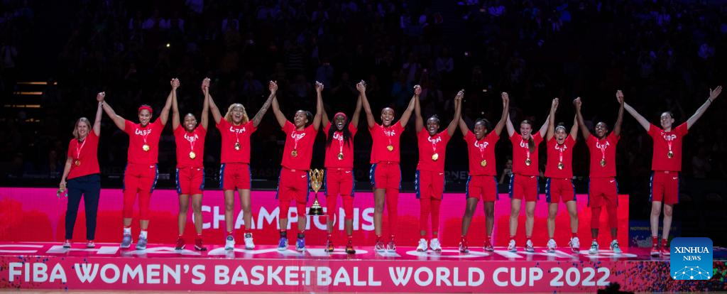 File photo taken on Oct. 1, 2022 shows team USA members celebrate during the awarding ceremony of the FIBA Women's Basketball World Cup 2022 in Sydney, Australia. (Xinhua/Hu Jingchen)