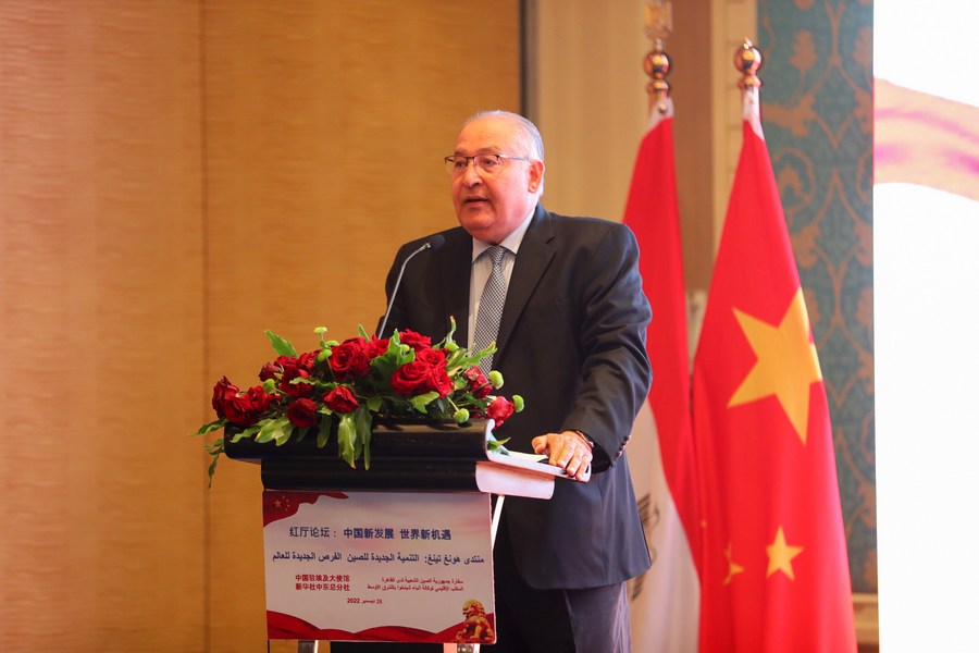 Ezzat Saad, director of the Egyptian Council for Foreign Affairs, addresses a symposium on Sino-Arab relations and ways to enhance them in the future, in Cairo, Egypt, Dec. 28, 2022. (Xinhua/Sui Xiankai)
