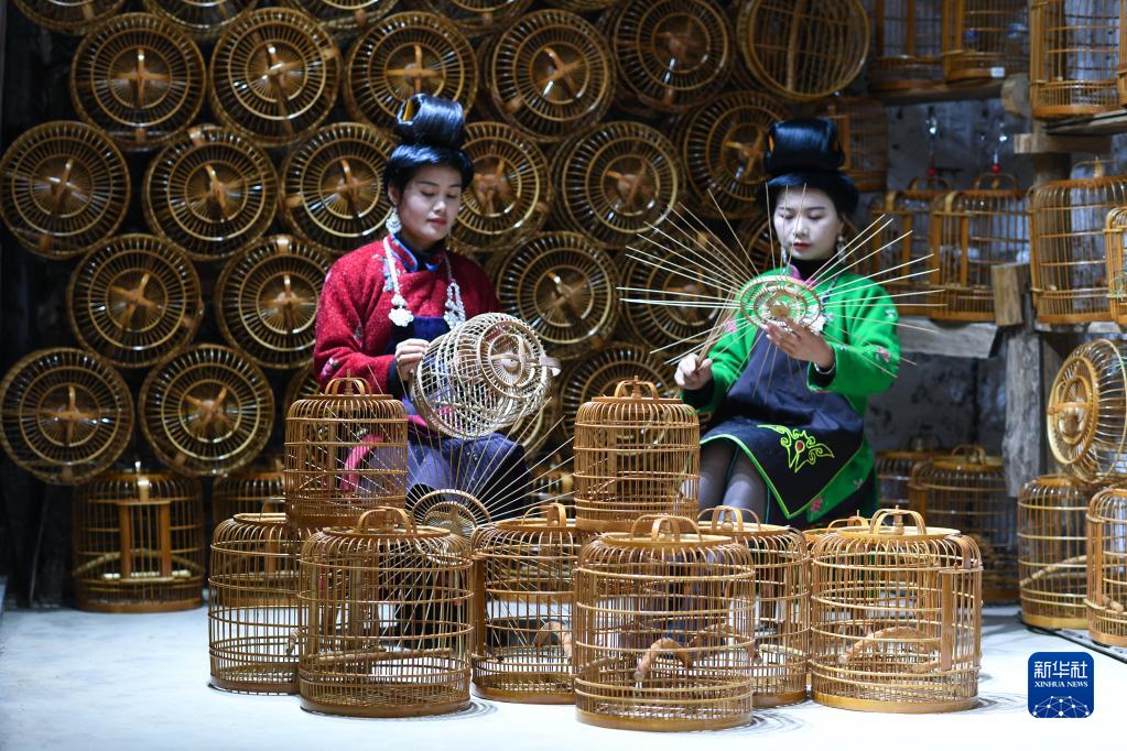 Wang Qiu (right), an inheritor of a traditional bird cage weaving technique, works on a bird cage in Kala village of Danzhai county, Qiandongnan Miao and Dong autonomous prefecture of southwest China's Guizhou Province, on Nov. 16, 2022. (Xinhua/Yang Wenbin)