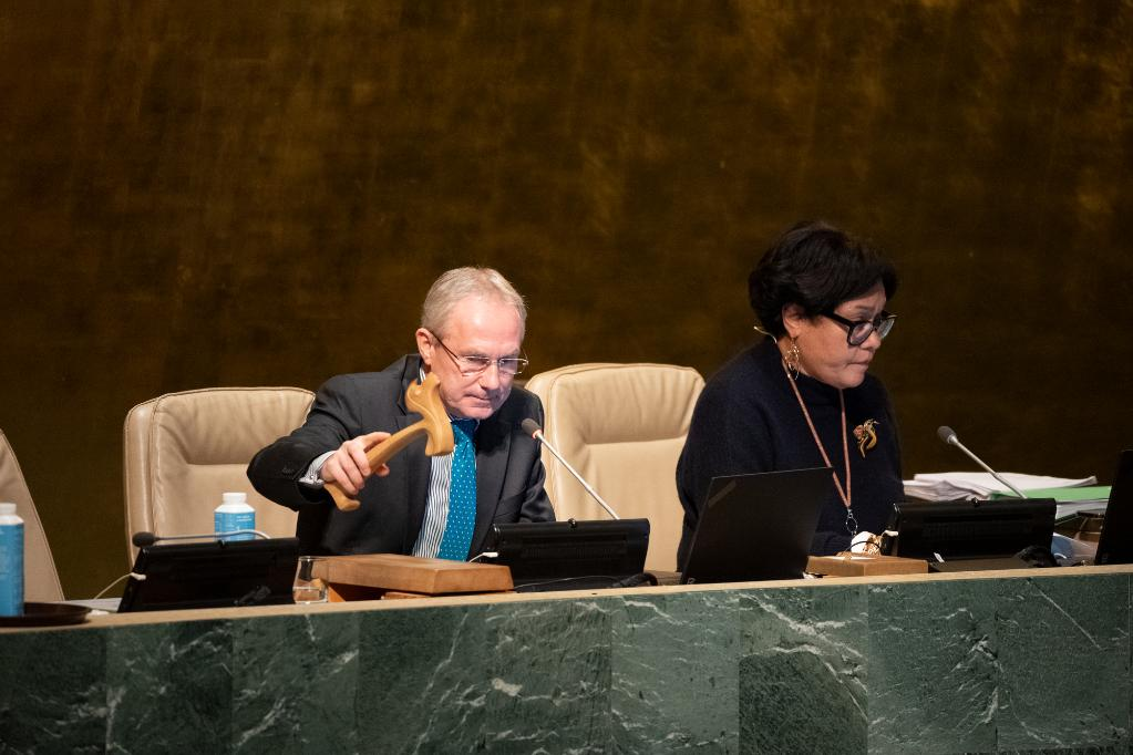 UN General Assembly President Csaba Korosi (L) presides over a plenary meeting of the assembly at the UN headquarters in New York on Dec. 30, 2022. (Evan Schneider/UN Photo/Handout via Xinhua)