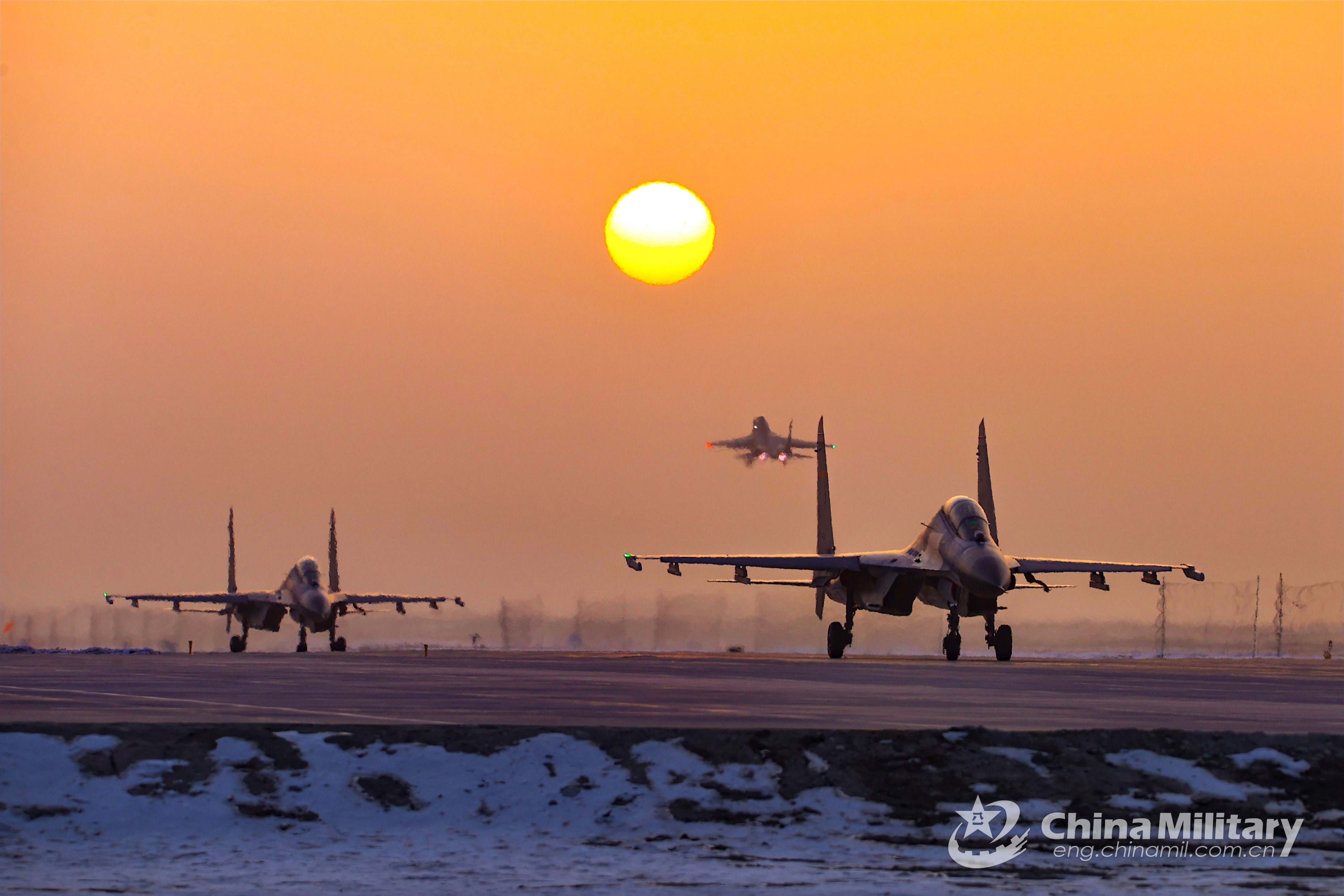 Two fighter jets attached to an aviation brigade of the air force taxi on the runway to get ready for a flight training exercise on December 9, 2022. (eng.chinamil.com.cn/Photo by Cui Baoliang)