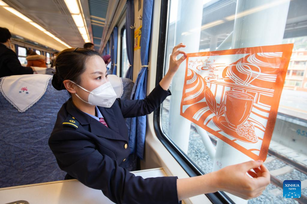 A stewardess decorates the train T8010 at Quanzhou railway station in Quanzhou, southeast China's Fujian Province, Dec. 30, 2022. (Xinhua/Zhou Yi)
