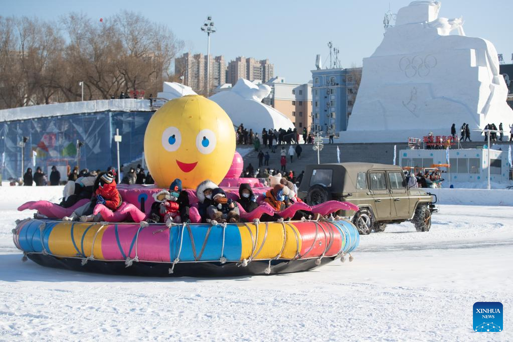 Tourists play at the Ice and Snow Carnival park on the Songhua River in Harbin, northeast China's Heilongjiang Province, Jan. 1, 2023. (Xinhua/Wang Jianwei)