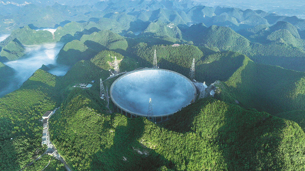 An aerial photo of 'eye on the sky', the Five-hundred-meter Aperture Spherical Telescope, which was taken by a drone in July. OU DONGQU/XINHUA