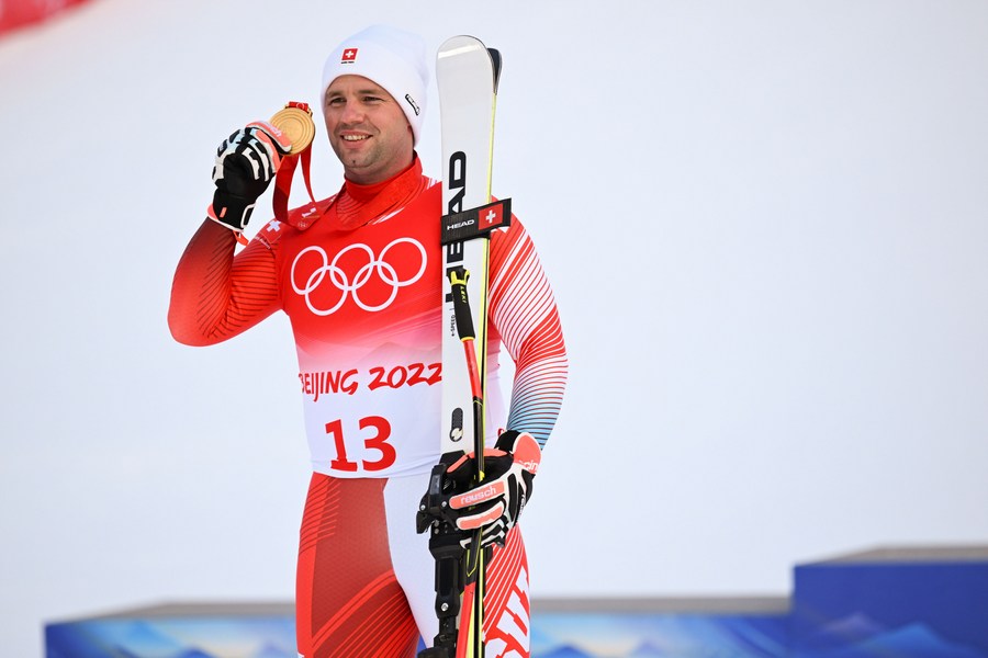 Beat Feuz of Switzerland poses for a photo during the medal ceremony of the Beijing 2022 Alpine Skiing Men's Downhill at the National Alpine Skiing Centre, Feb. 7, 2022. (Xinhua/Chen Bin)