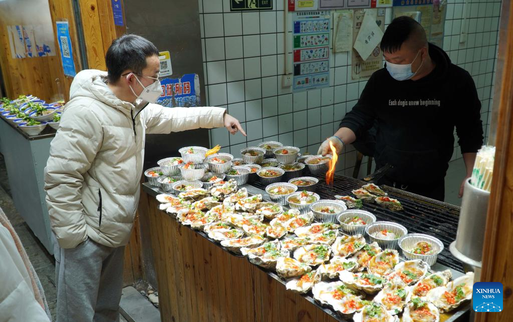 People buy food on Furong Street in Jinan, east China's Shandong Province, Jan. 2, 2023. (Xinhua/Xu Suhui)