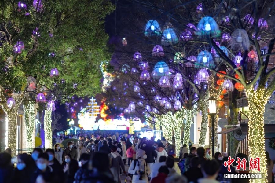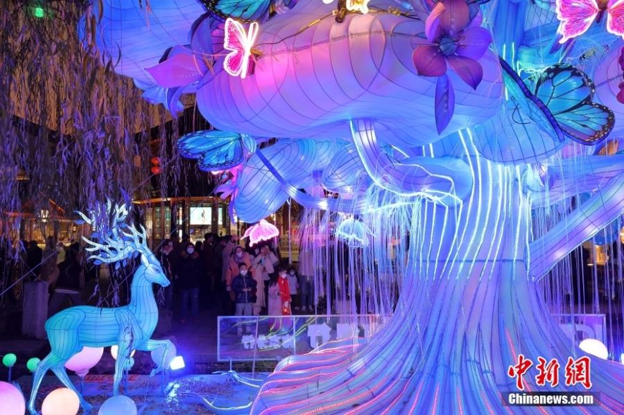 Colorful lanterns are illuminated to welcome the upcoming Year of the Rabbit in Nanjing, east China's Jiangsu Province, Jan. 3, 2022. (Photo: China News Service/Yang Bo)