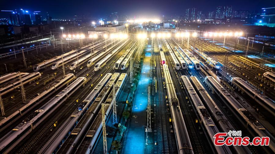 High-speed bullet trains are ready for service on storage tracks as inspection and preparation work wraps up at a maintenance base in Chengdu, southwest China's Sichuan Province on Jan. 3, 2023. (Photo: China News Service/Xiong Neng)