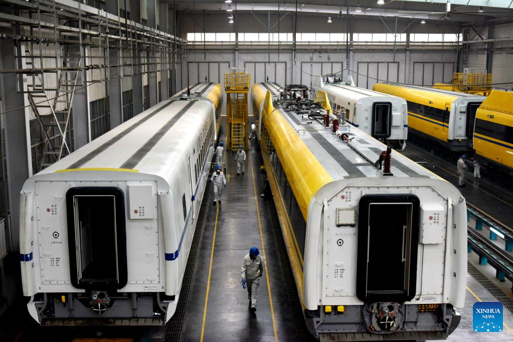 Technicians debug trains at a workshop of CRRC Qingdao Sifang Co., Ltd. in Qingdao, east China's Shandong Province, Jan. 4, 2023. (Xinhua/Li Ziheng)