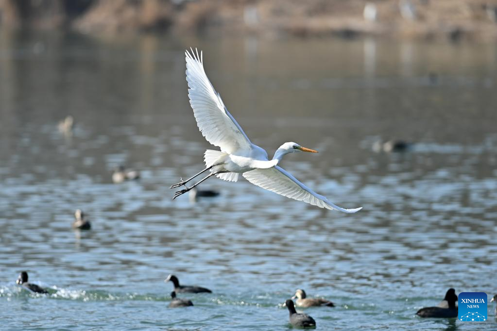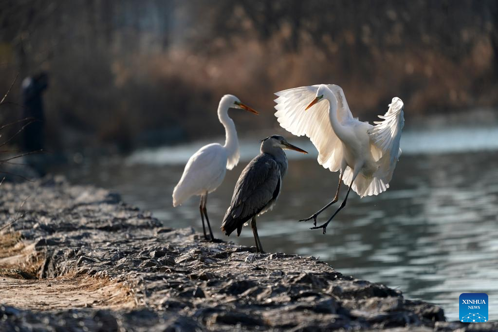Egrets forage at Fenhe River in Taiyuan, capital city of north China's Shanxi Province, Jan. 4, 2023. (Xinhua/Yang Chenguang)