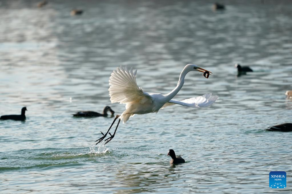 An egret forages at Fenhe River in Taiyuan, capital city of north China's Shanxi Province, Jan. 4, 2023. (Xinhua/Zhan Yan)