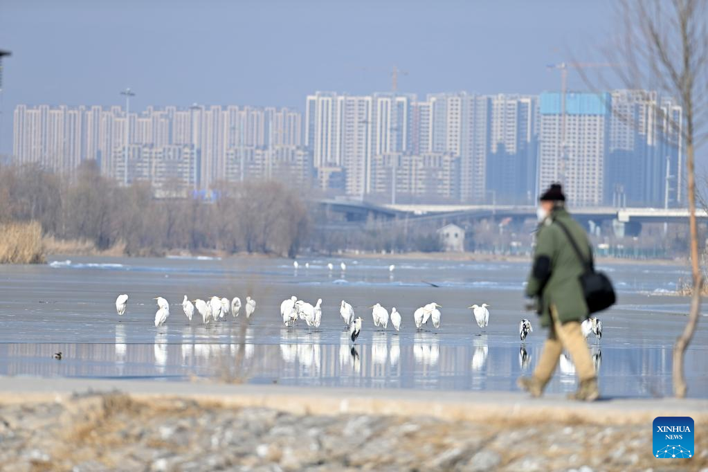 Egrets rest along Fenhe River in Taiyuan, capital city of north China's Shanxi Province, Jan. 4, 2023. (Xinhua/Zhan Yan)