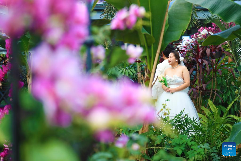 A couple poses for pre-wedding photos in Shenyang Expo Garden in Shenyang, northeast China's Liaoning Province, Jan. 3, 2023. (Xinhua/Yang Qing)