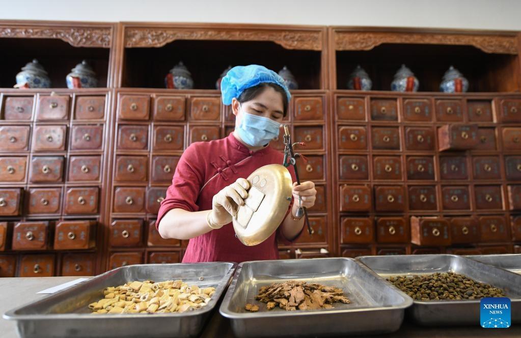 A pharmacist weighs ingredients to produce traditional Chinese medicine (TCM) decoctions at the First Teaching Hospital of Tianjin University of Traditional Chinese Medicine in north China's Tianjin, Jan 12, 2022. [Photo/Xinhua]