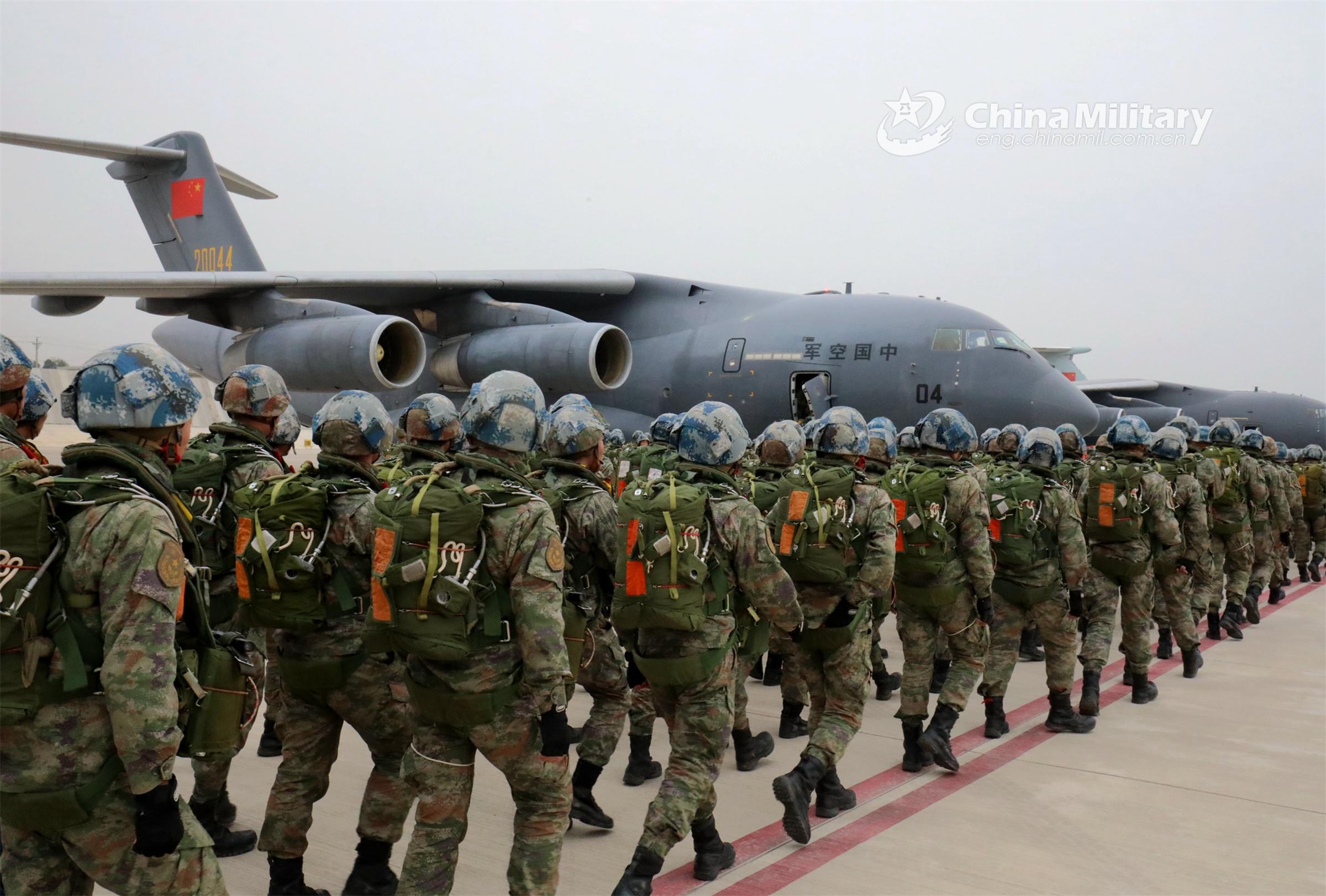 Airmen assigned to an airborne brigade of the PLA Air Force queue up for boarding during a parachuting training exercise in late December, 2022. (eng.chinamil.com.cn/Photo by Ma Pengfei)