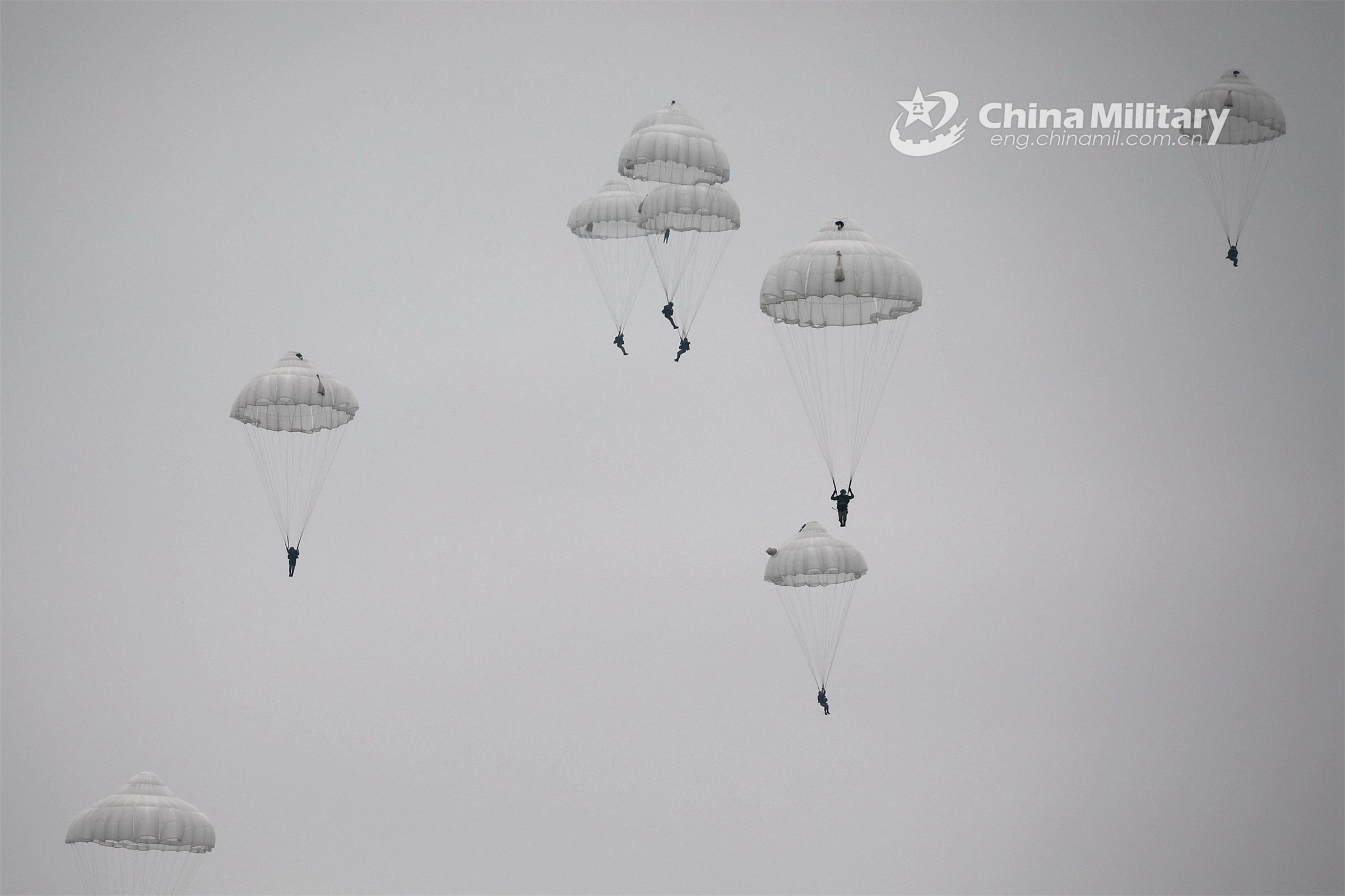 Airmen assigned to an airborne brigade of the PLA Air Force descend to the drop zone with their parachutes during a parachuting training exercise in late December, 2022. (eng.chinamil.com.cn/Photo by Ma Pengfei)