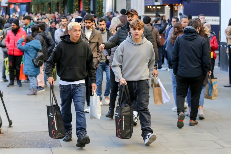 People are seen with shopping bags on a street during Boxing Day sales in London, Britain, on Dec. 26, 2022. (Photo by Dinendra Haria/Xinhua)