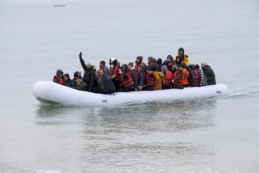 Migrants arrive on a beach in Dungeness, Britain on Nov. 24, 2021. (Photo by Steve Finn/Xinhua)