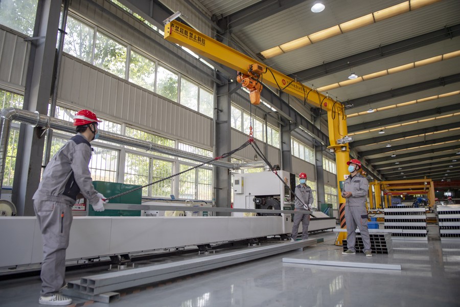 Staff members prepare steel to be processed at the workshop of the Anhui Electric Power Transmission & Transformation Co., Ltd. in Hefei, east China's Anhui Province, May 13, 2022. (Photo by Zheng Xianlie/Xinhua)