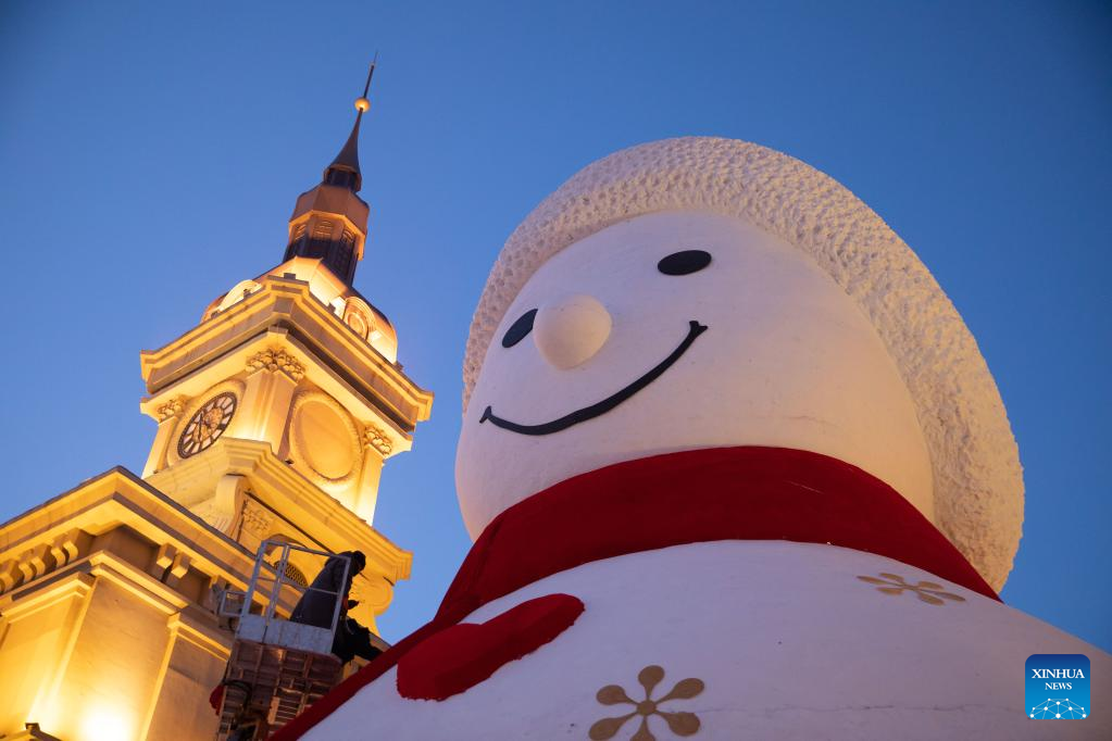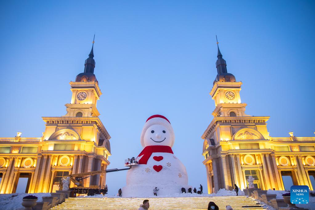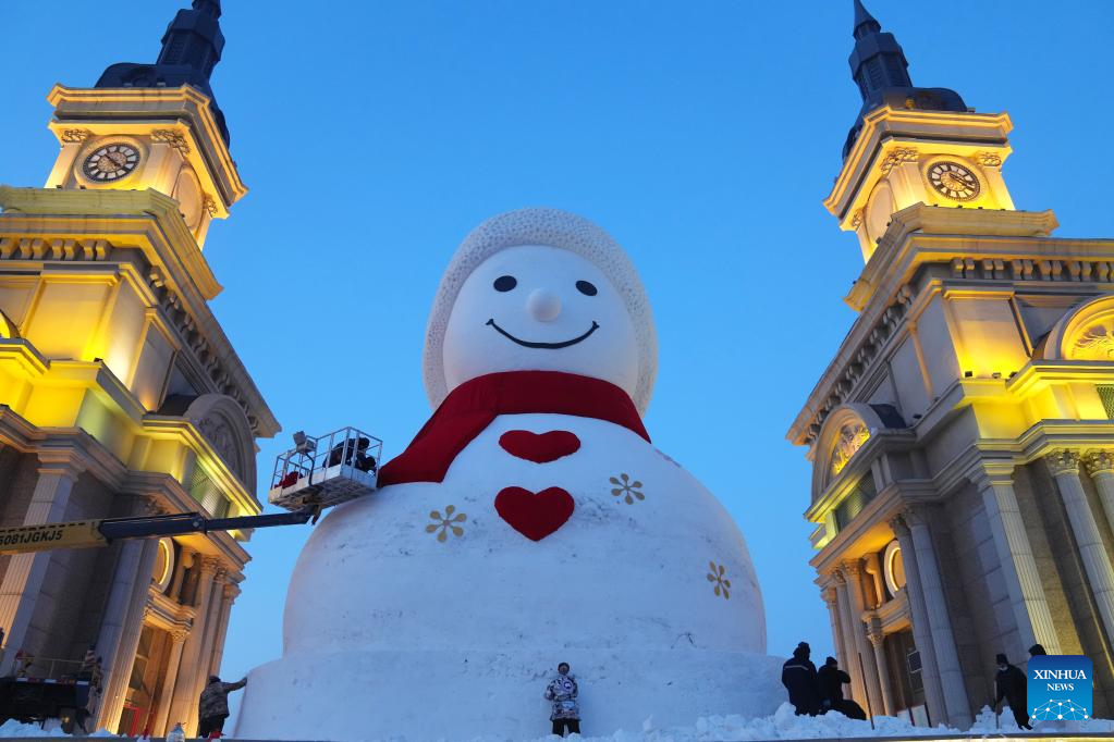 Workers do finishing work of the giant snowman near the Songhua river in Harbin, northeast China's Heilongjiang Province, Jan. 4, 2023. (Xinhua/Zhang Tao)