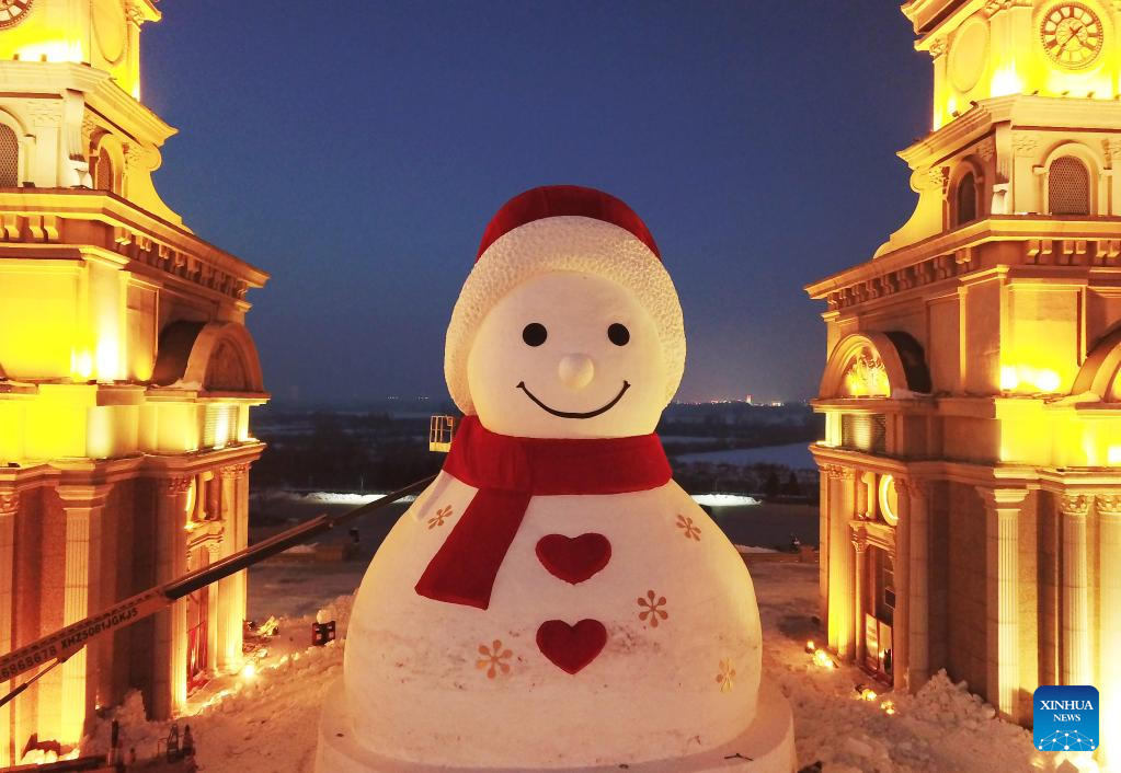 The giant snowman, 18 meters in height and made with 2,000 cubic meters of snow, becomes a landmark of Harbin, northeast China's Heilongjiang Province.