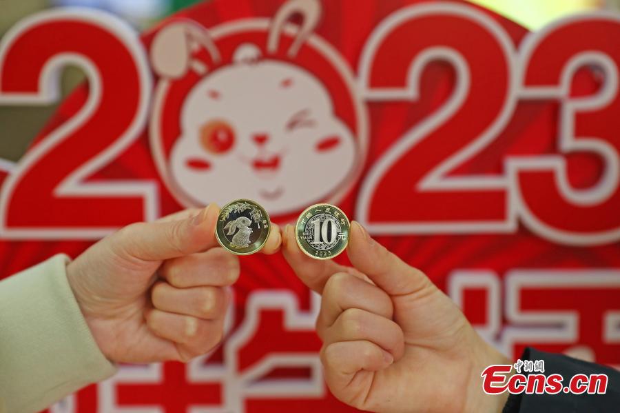 Staff members display the commemorative coins for the Year of the Rabbit at the Jiangxi branch of the Postal Saving Bank of China in Nanchang, east China's Jiangxi Province, Jan. 5, 2023. (Photo: China News Service/Liu Zhankun)