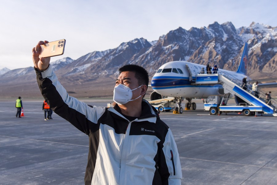 A passenger takes selfies at the Taxkorgan airport in Taxkorgan Tajik Autonomous County, northwest China's Xinjiang Uygur Autonomous Region, Dec. 23, 2022.(Xinhua/Ding Lei)