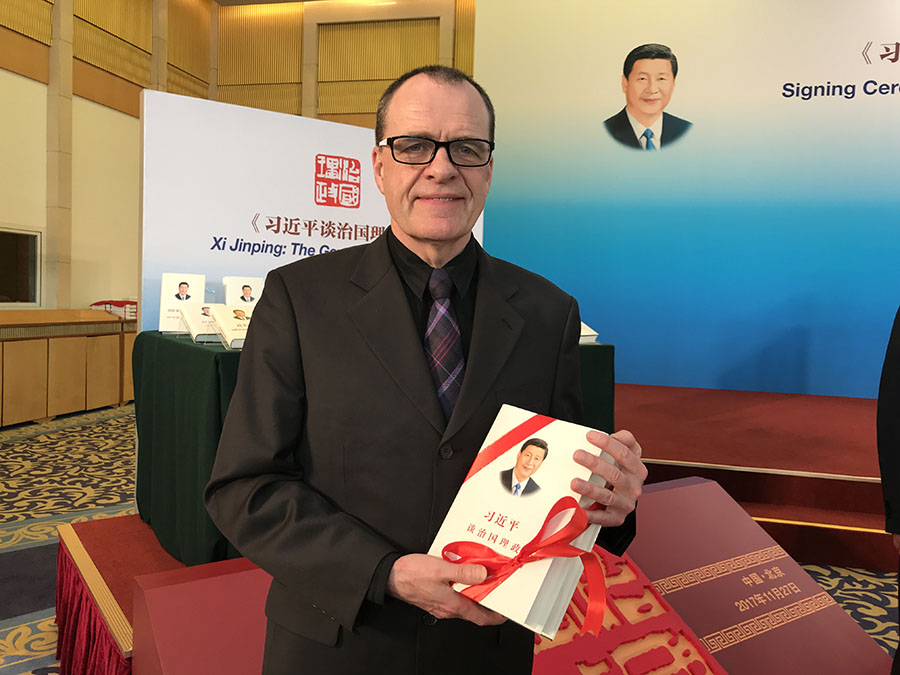Photo taken on November 27, 2017, shows David Ferguson holding a copy of “Xi Jinping: The Governance of China” at a signing ceremony in Beijing (Photo courtesy of the Foreign Language Press)