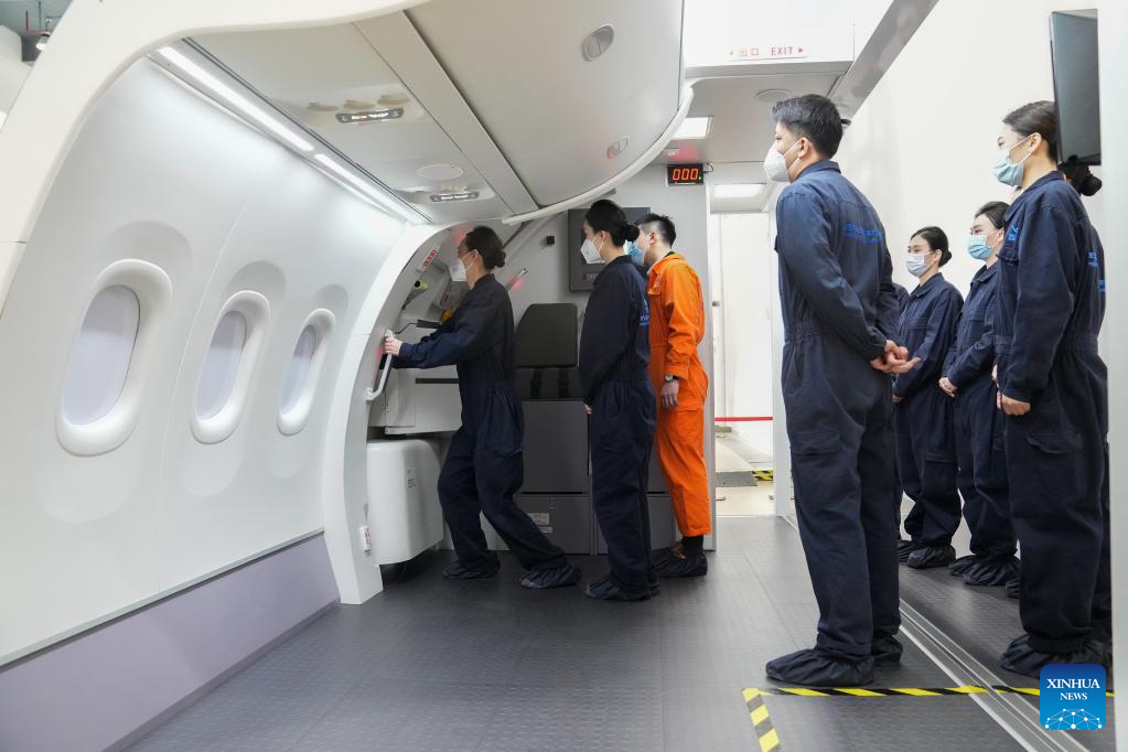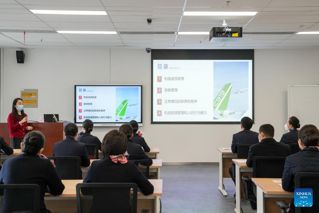 Flight attendants of China Eastern Airlines have attended intensive training by COMAC Shanghai Aircraft Customer Service Co., Ltd. in Shanghai, east China for the C919 to ensure smooth operation of the aircraft on Friday.