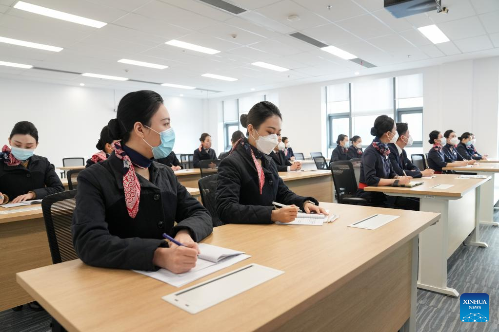 Flight attendants of China Eastern Airlines' C919 attend a training course by COMAC Shanghai Aircraft Customer Service Co., Ltd. in Shanghai, east China, Jan. 6, 2023. (Xinhua/Ding Ting)