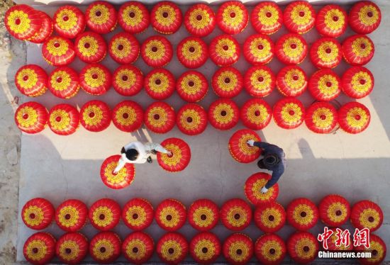 Aerial photo shows villagers sorting red lanterns in Tuntou village, Gaocheng district, Shijiazhuang city, north China's Hebei Province, Jan. 4, 2023. As the Spring Festival approaches, villagers are busy making red lanterns. (China News Service/Zhai Yujia)