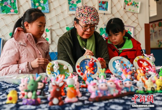Students learn to make clay rabbit dolls to greet the upcoming Spring Festival at a school in Rongcheng city, east China's Shandong Province, Jan. 4, 2023. (China News Service/Li Xinjun)
