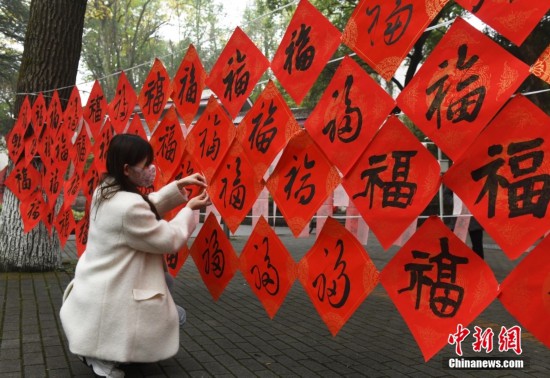 A student chooses a Chinese character "Fu," which means fortune and good luck, at Southwest University in southwest China's Chongqing Municipality, Jan. 3, 2023. The School of Fine Arts under the university held an activity to write the Chinese character "Fu" for the university's teachers and students for the upcoming Spring Festival. (China News Service/Zhou Yi)