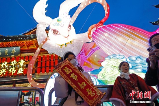 Tourists pose for photos during the Yuyuan Garden Lantern Show for the upcoming Spring Festival in Shanghai, Jan. 1, 2023. (China News Service/Yin Liqin)