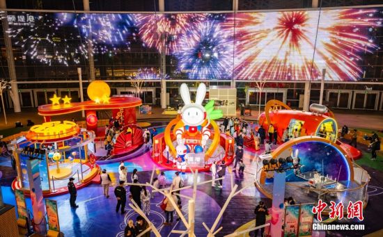 Rabbit-themed decorations for the upcoming Spring Festival are found in a shopping mall in Chaoyang district of Beijing, Jan. 2, 2023. (China News Service/Hou Yu)