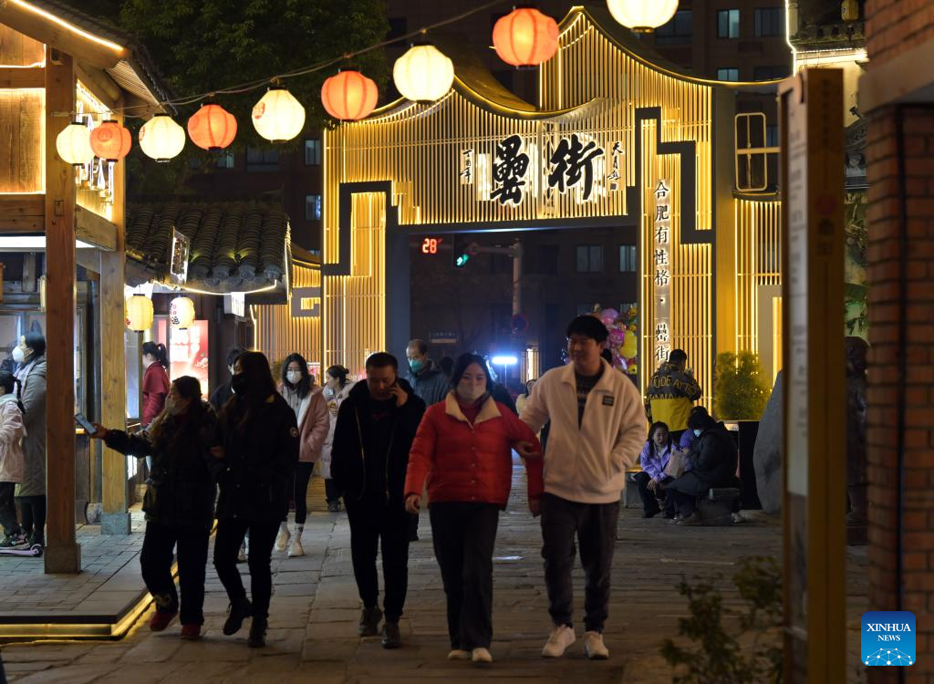 People walk on Leijie street, a commercial area famous for its night economy, in Hefei, east China's Anhui Province, Jan. 6, 2023. The night-time consumption in the commercial area has resumed in an orderly manner recently. (Xinhua/Zhou Mu)