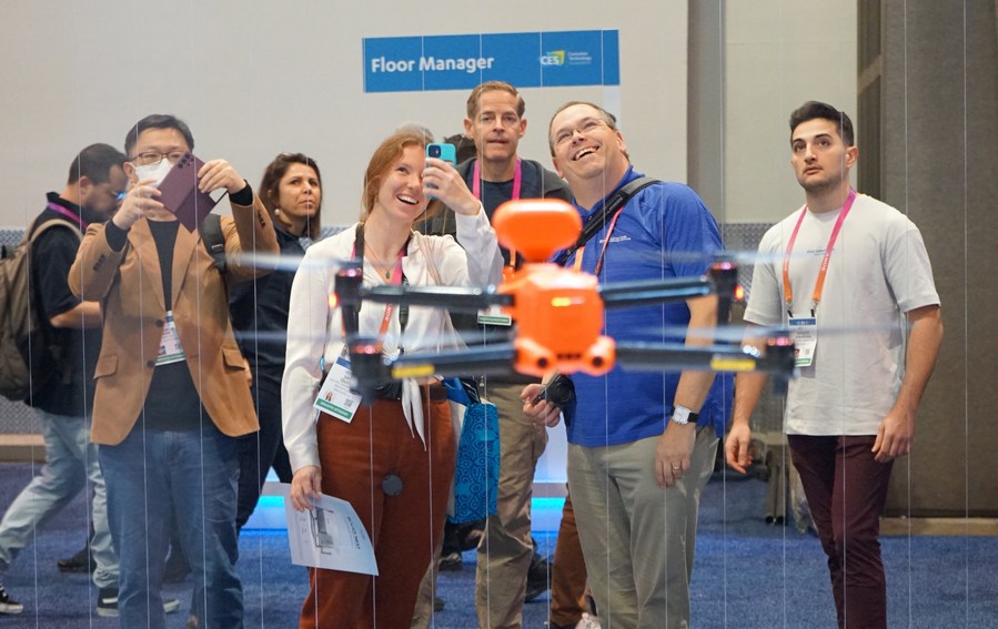 People look at a drone in the exhibition area of Chinese company Autel Robotics during the 2023 Consumer Electronics Show (CES) in Las Vegas, the United States, Jan. 6, 2023. (Photo by Zeng Hui/Xinhua)