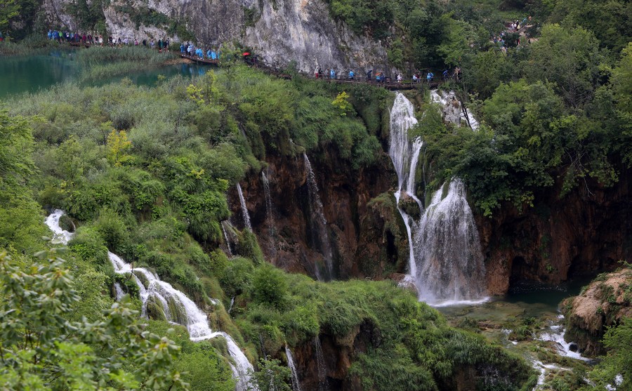 Tourists visit Plitvice Lakes National Park in Croatia, on Aug. 5, 2021. (Kristina Stedul Fabac/Pixsell via Xinhua)
