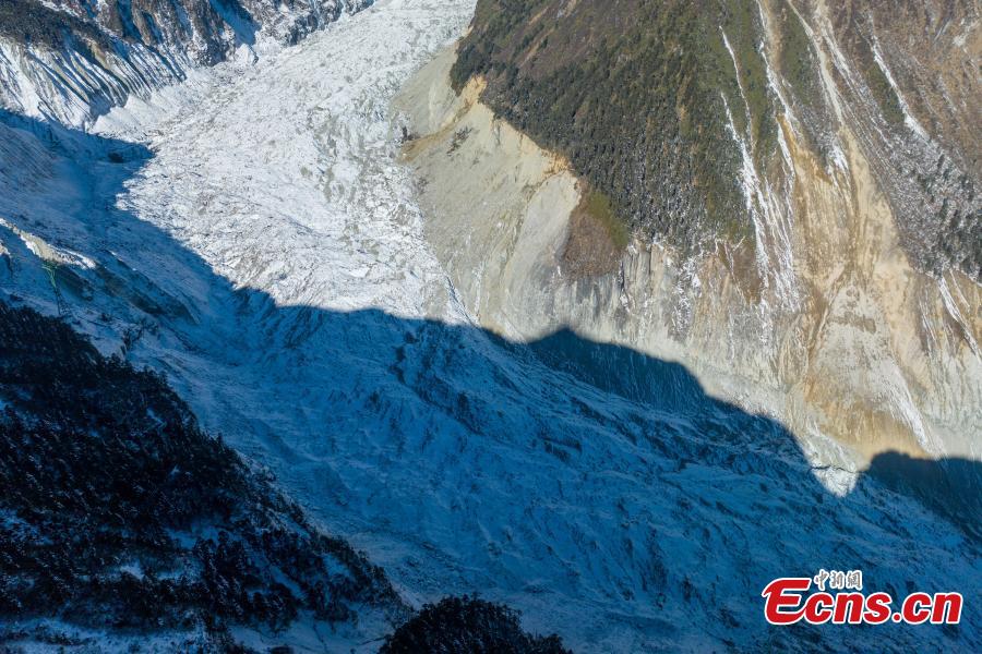 Aerial photo taken on Jan. 9, 2023 shows an icefall coming down from Gongga Mountain in Hailuogou Glacier Park of Luding County, Sichuan Province, four months after the park was rattled by a magnitude-6.8 earthquake. (Photo: China News Service/Liu Zhongjun)