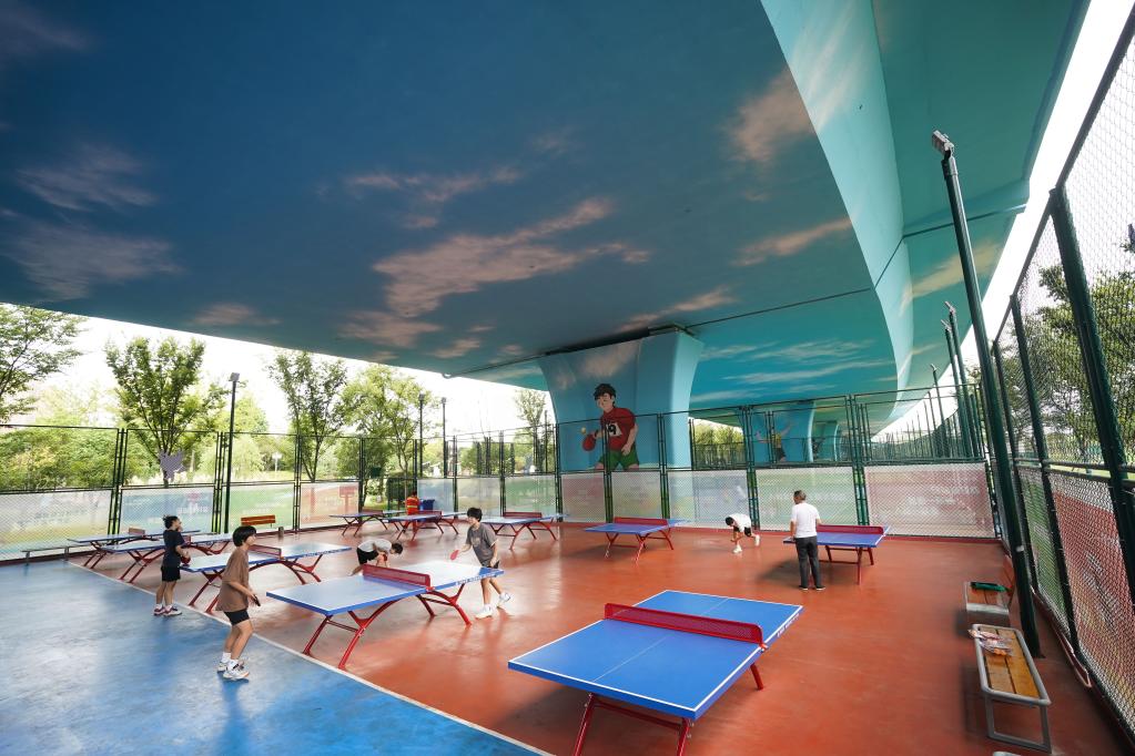 People play table tennis in a sports compound built under a city overpass in Taizhou of east China's Jiangsu Province, Aug. 28, 2022. (Xinhua/Ji Chunpeng)