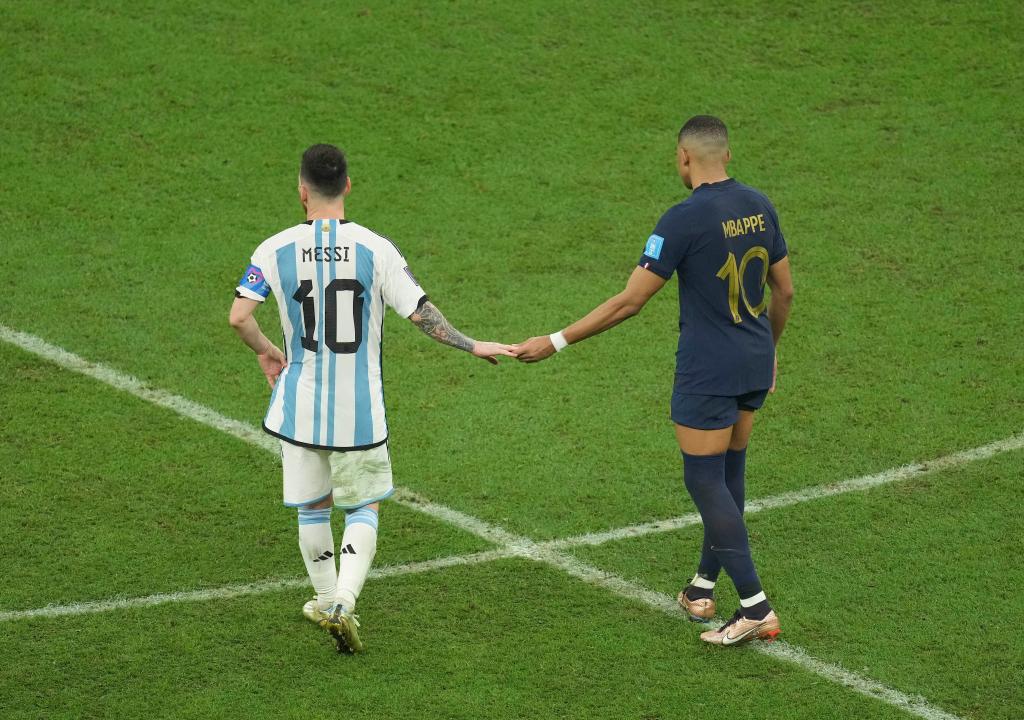 Lionel Messi (L) of Argentina greets Kylian Mbappe of France during the final between Argentina and France at the 2022 FIFA World Cup at Lusail Stadium in Lusail, Qatar, Dec. 18, 2022. (Xinhua/Pan Yulong)