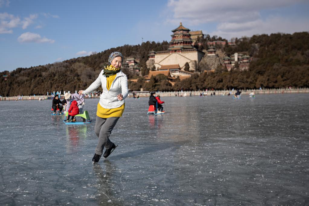 Qu Wei, 67 years old, skates on the ice rink of Summer Palace in Beijing, capital of China, Jan. 10, 2022. Qu Wei has won the champion of 1985 Beijing youth figure skating open championship. She once studied figure skating at Beijing Shichahai Sports School and didn't give up the sports even after she left the school. However, Qu Wei barely skated after an accident resulting in fracture of left ankle at the age of 40. The upcoming Beijing Winter Olympics reignited her passion toward skating. She started skating again after over 20 years. (Xinhua/Wu Zhuang)