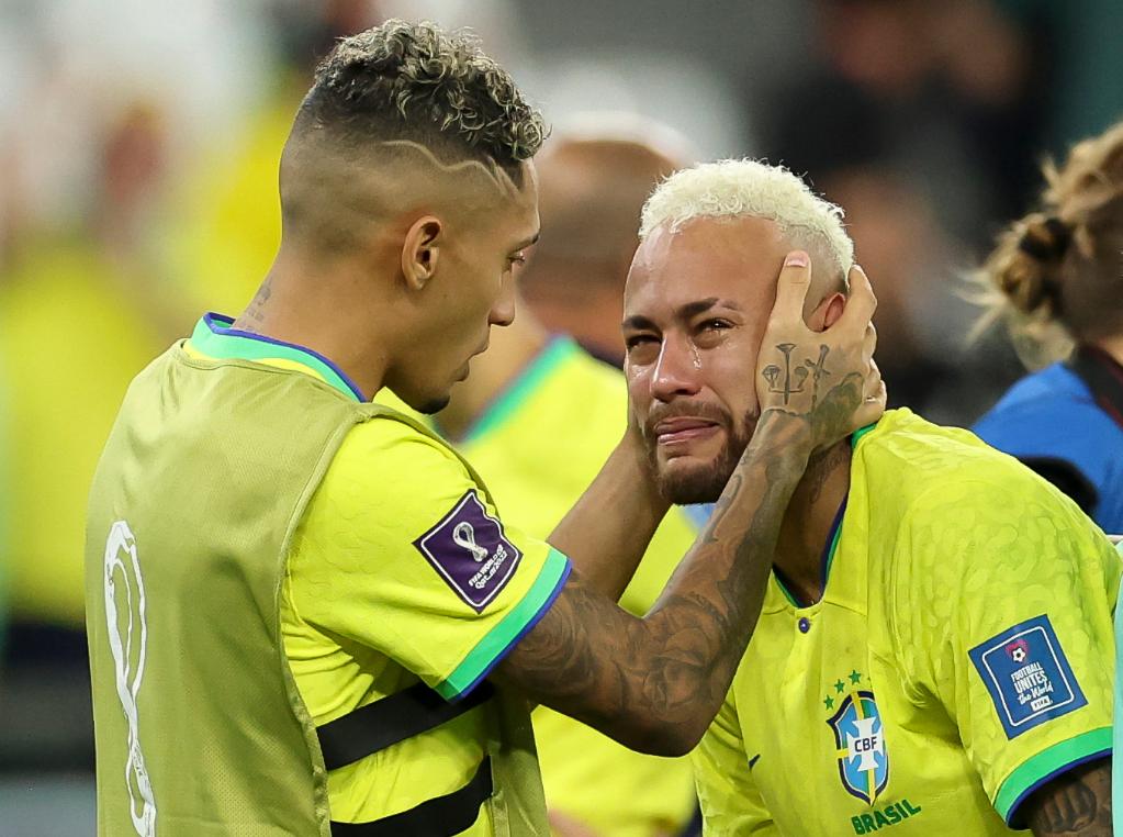 Neymar (R) of Brazil cries after the quarterfinal between Croatia and Brazil of the 2022 FIFA World Cup at Education City Stadium in Al Rayyan, Qatar, Dec. 9, 2022. (Xinhua/Han Yan)