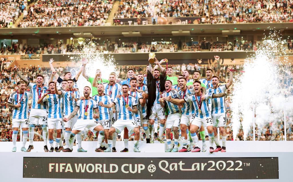 Winner Team Argentina celebrate during the awarding ceremony of the 2022 FIFA World Cup at Lusail Stadium in Lusail, Qatar, Dec. 18, 2022. (Xinhua/Li Ming)
