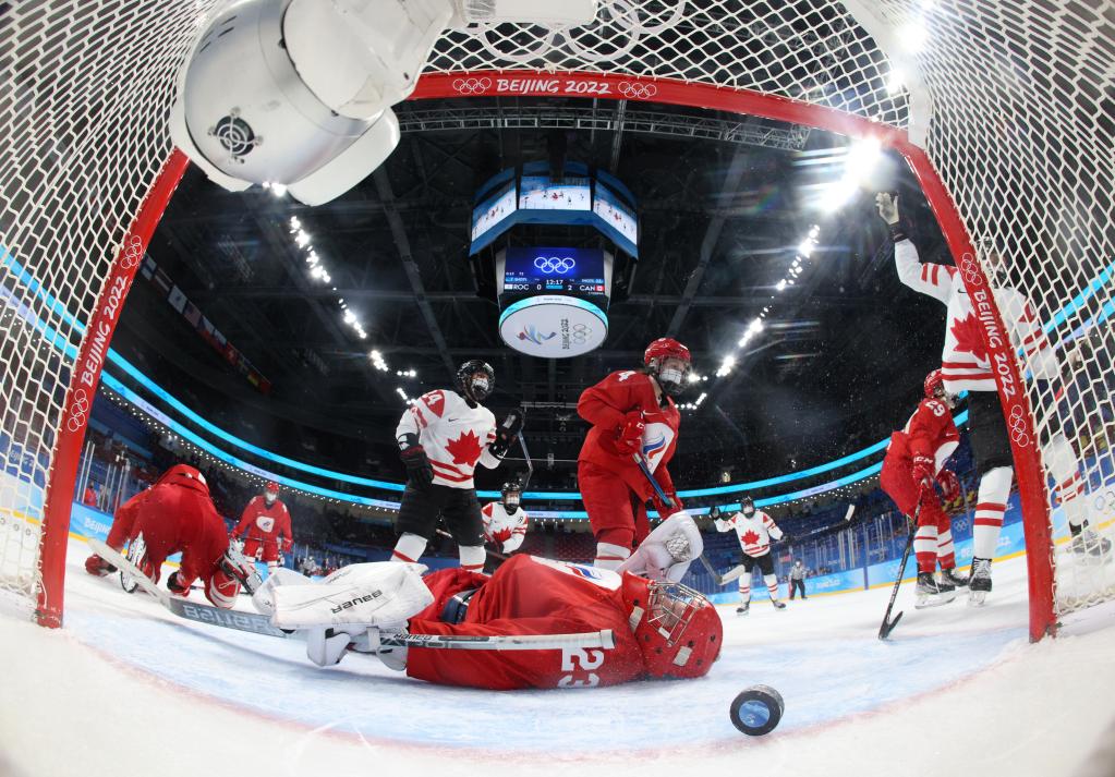 Goalkeeper Daria Gredzen (front) of ROC lies on her back after failing to save a goal against Canada during a preliminary round women's hockey game at the Beijing 2022 Olympic Winter Games in Beijing, capital of China, Feb. 7, 2022. (Xinhua/Song Yanhua)